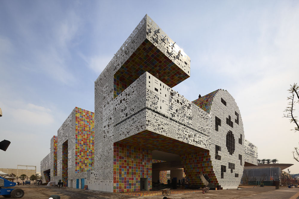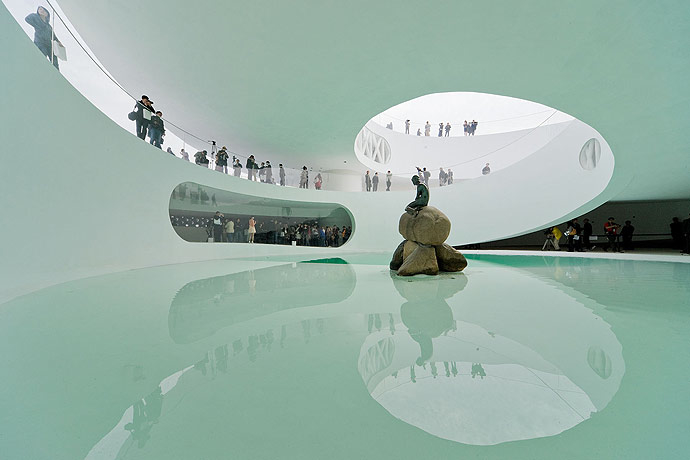 Bjarke Ingels really got this idea with The Danish Pavilion he designed. A simple ramp structure, it offers visitors the opportunity to borrow real Copenhagen city bikes, paddle in clean water taken from Copenhagen’s harbour and transported to Shanghai as balast on ships, and as Ingels himself puts it, ‘the ultimate gesture of the real deal, they can see the actual Little Mermaid at the heart of the harbour pool.’ And, indeed, there she sits, just for the visitor. That subtle whoring of the material culture of ones country wins my vote.