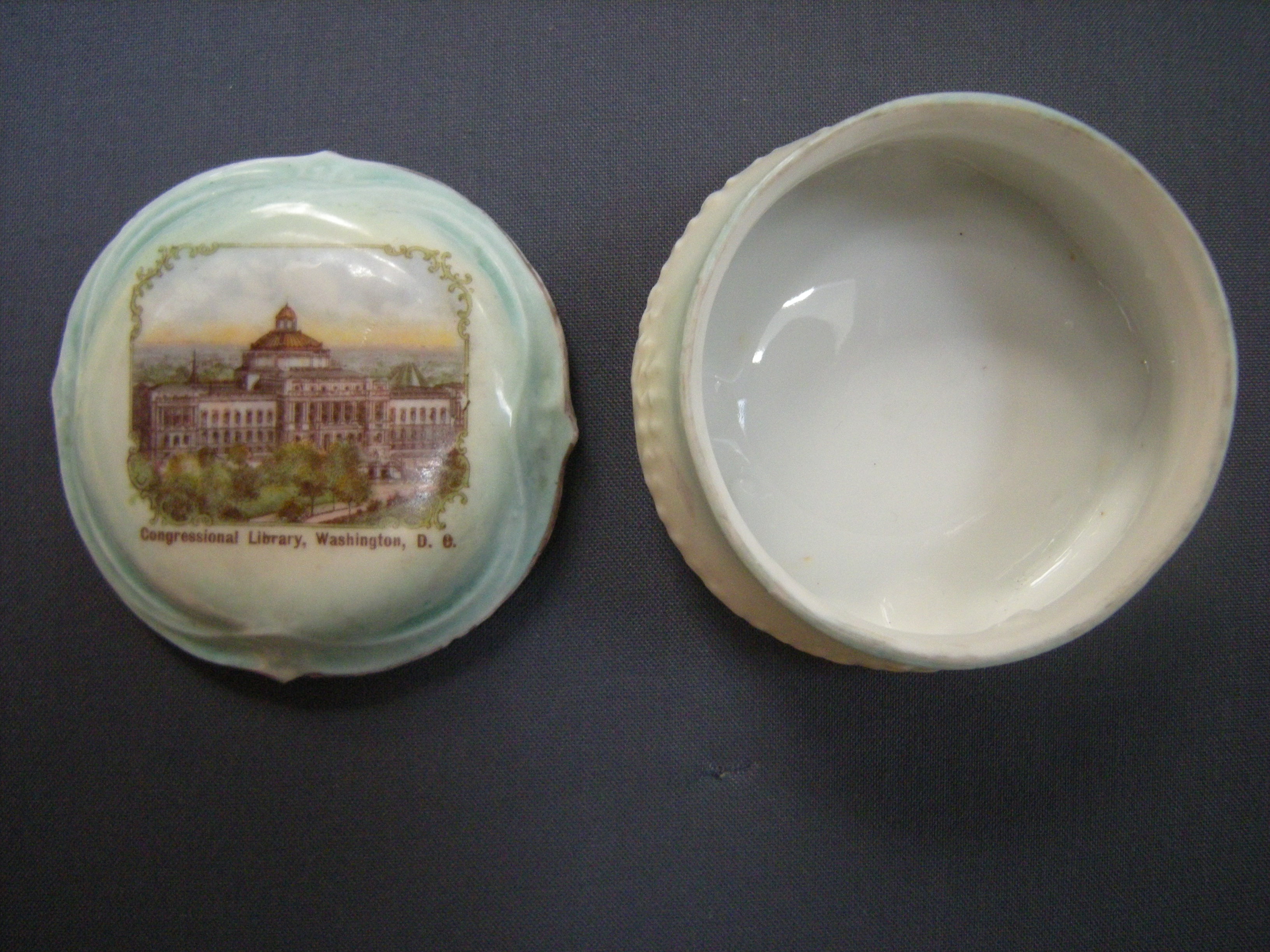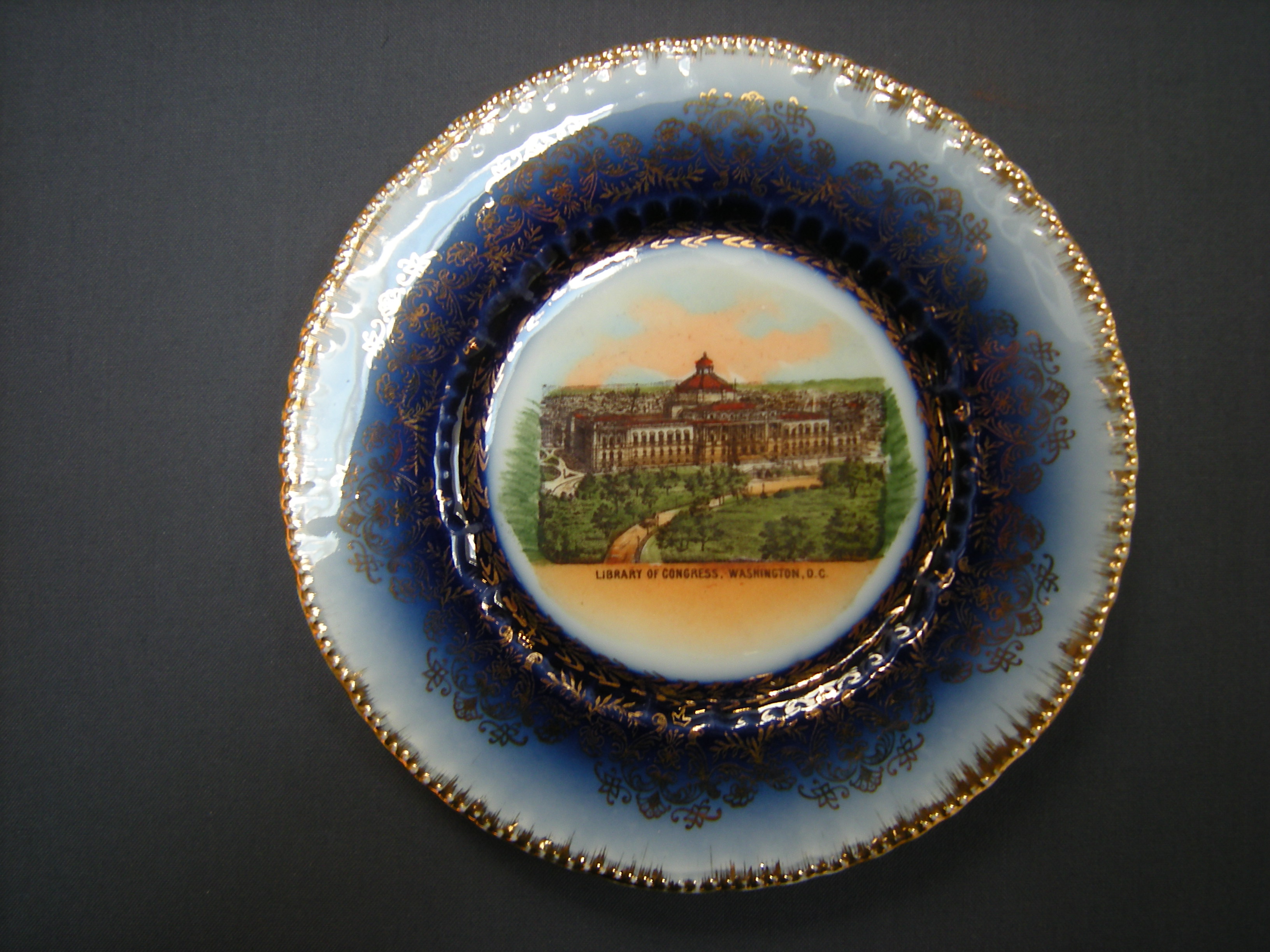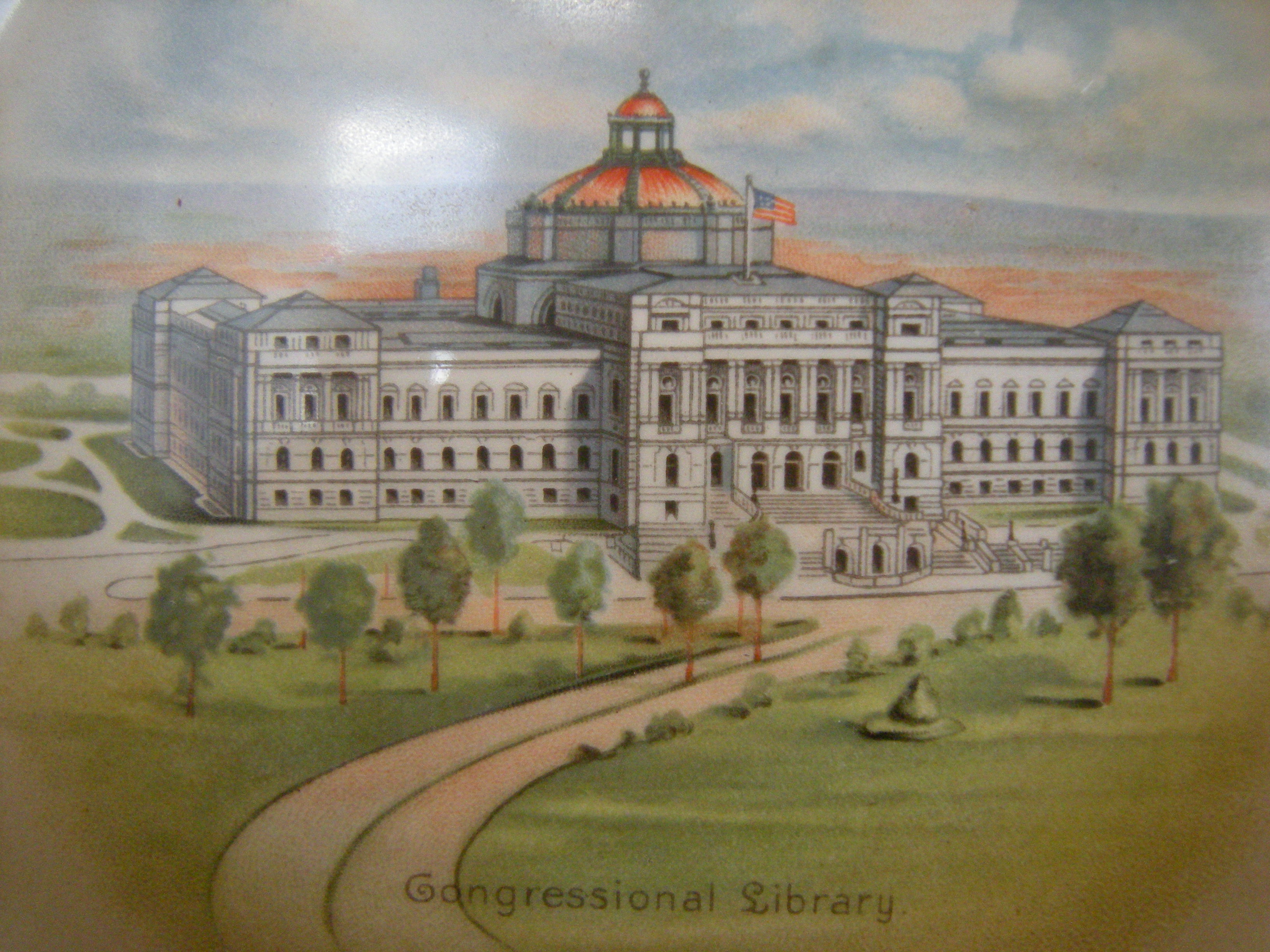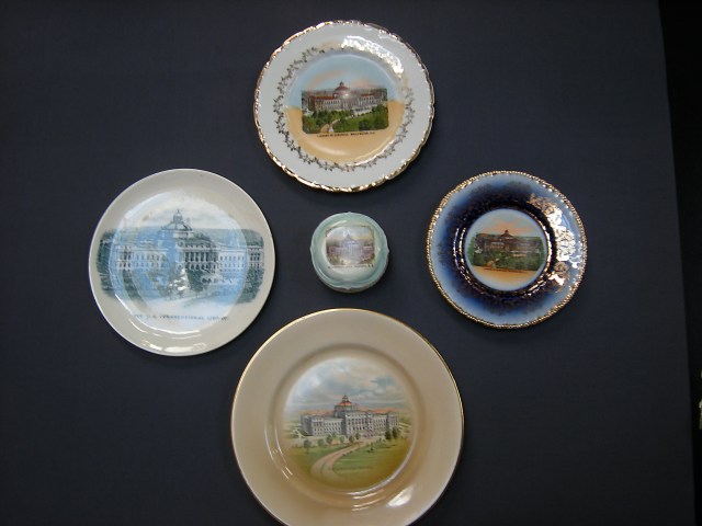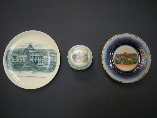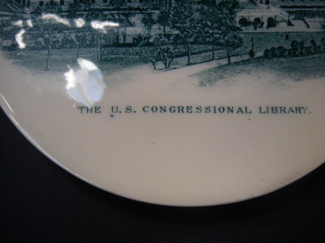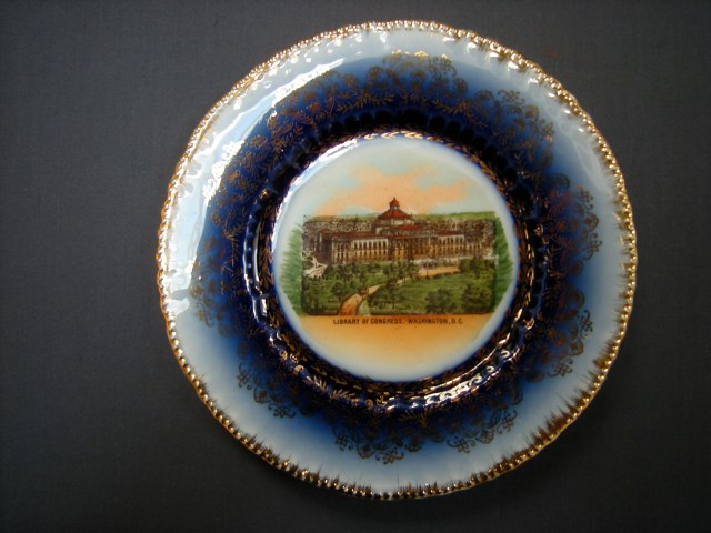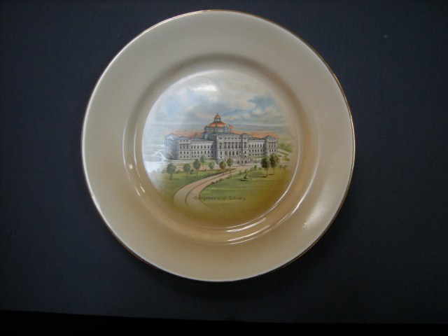 There is something disquieting about looking at a series of plates with similar images of the Library of Congress in Washington DC on them. It is not altogether clear where they are simply mementoes purchased in a souvenir shop or if they are smaller limited editions, gifts to privileged users or friends of the library. Perhaps it was to make the former feel like the latter. Representative of the collection as a whole, the plates shown here depict the library in isolation, representing it in a time before neighboring buildings were built or simply blurring them out. In an attempt to help me explain them, the CCA’s Head of Collection Reference Renata Gutman found an essay by Dale Allen Gyure The Heart of the University: A History of the Library as an Architectural Symbol of American Higher Education Winterthur Portfolio 42 (Summer/Autumn 2008) on the role of the library in American campuses.