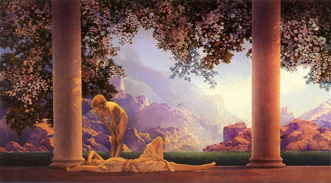 The method by which it is painted involves a long time. I love the work of the American illustrator Maxfield Parrish. He loved to paint paintings of mainly naked asexual young people disporting themselves in some idyllic environment. In the 1920s or 1930s he was very popular and many houses in the US had a print of a particular painting he’d done which was set on a terrace with classical columns in front of a lake with mountains on the other side of the lake. So ideal. And I saw one of these in the flesh and it was full of light in beautiful gradations of colours and all without the single evidence of a brush stroke. To hell with modern art and Picasso. Maxfield Parrish is skill without invention… it is quality kitsch.