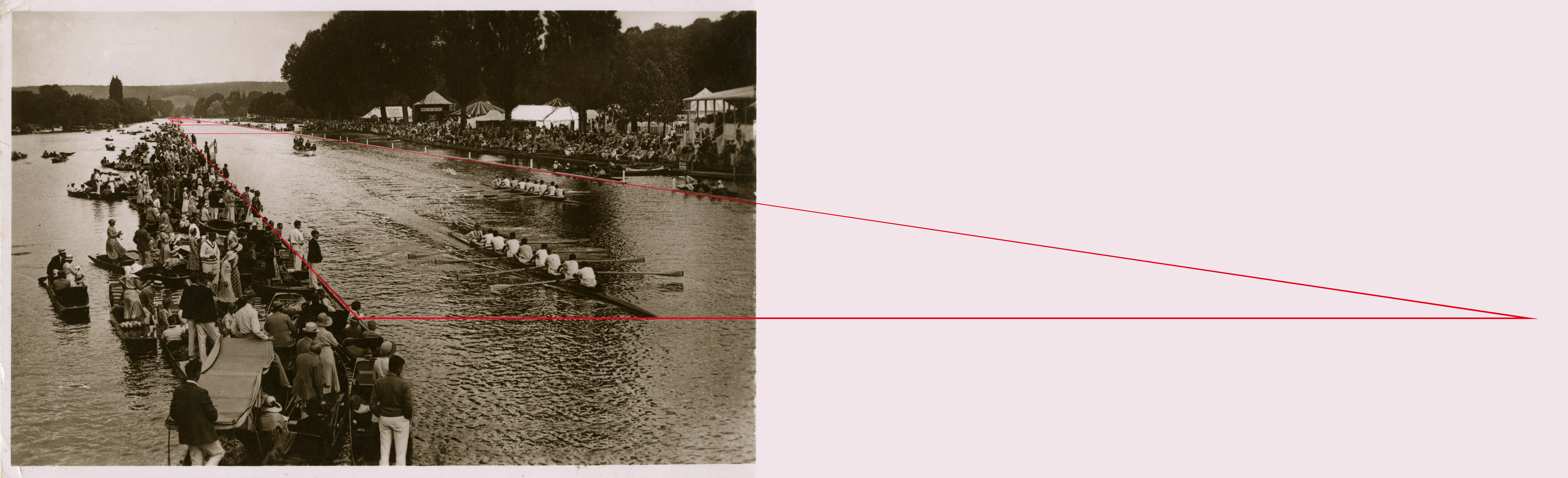 The photographer has exposed the film at the precise moment the prow of the leading boat touches the finish line. For eternity will the winning team savour their triumph and the losers the ignominy of their defeat.