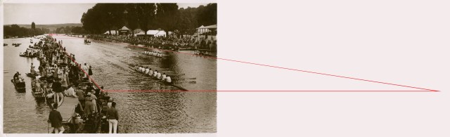 I am a romantic soul but strictures imposed by the Anglican church and school training make romanticism acceptable only if it is trammeled; contained within a rigorous mathematical or philosophical corset. If you happen to think of the postcard view of the regatta as an elevation rather than as a perspective then you can move things around and not violate any law of perspective. So if you move the umpires launch forward to the front of the image, it would appear much smaller because you don’t change the size when you bring it forward. So the guys rowing would look to their right and see a tiny little boat there with old men in it. I thought that image would be very funny.