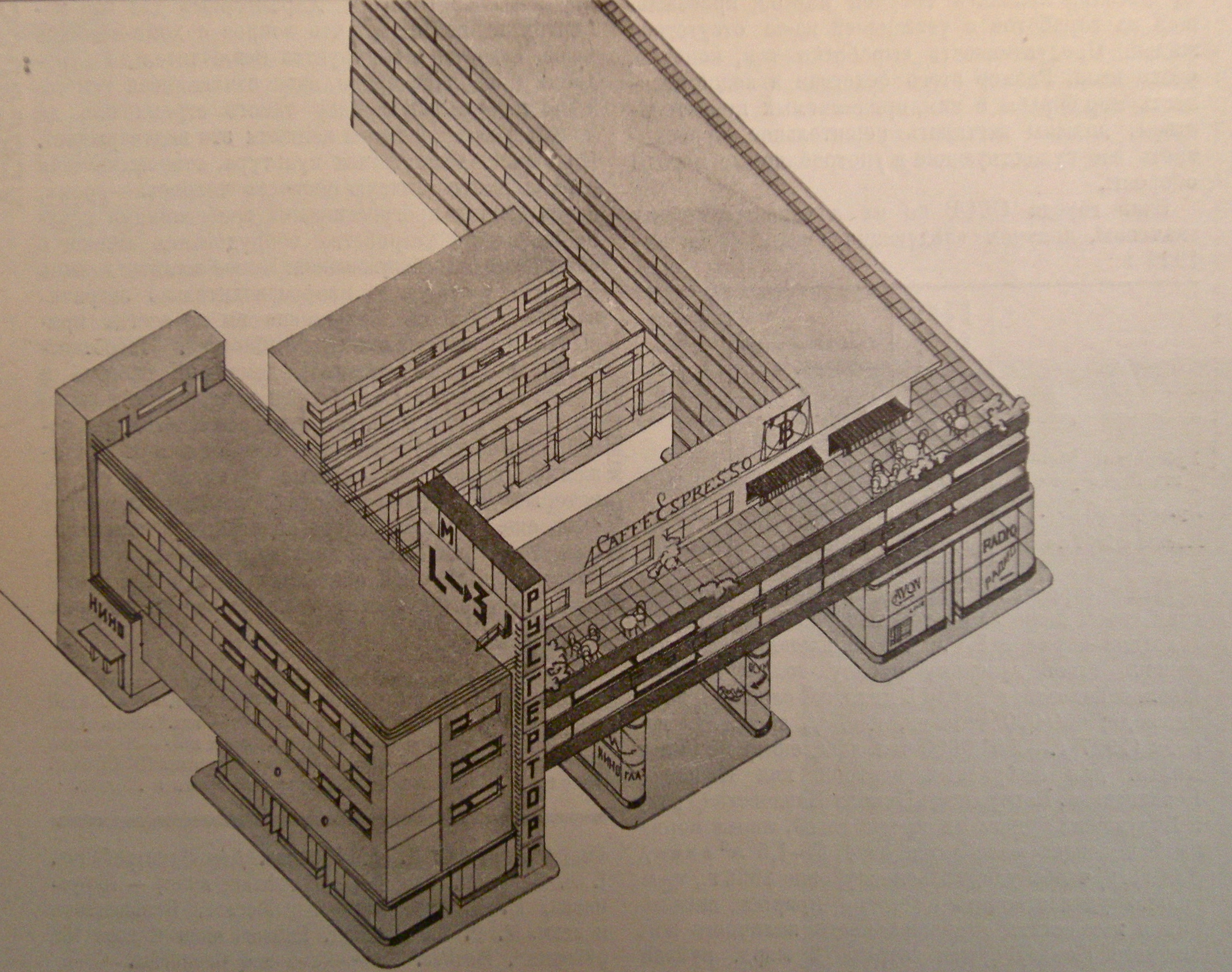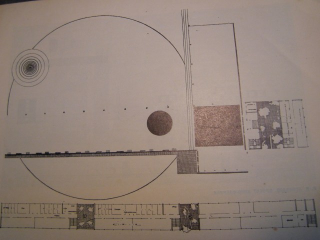 Frightened that Constructivism might turn into a purely external and formal style, Constructivists concentrated on the formulation of a set of artistic beliefs and the foundation of an organisation uniting the movement – the OSA. The OSA established the magazine Contemporary Architecture or SA as it is known in Russian. It began with the slogan ”Contemporary architecture must crystallize the new socialist way of life.” The way Khan-Magomedov describes it, if there was going to be a repetition of the constructivist style then they at least would ensure that it adhered to the political motive behind it. Editorial meetings had a relatively fluid membership but the eldest Vesnin sat over it all.
