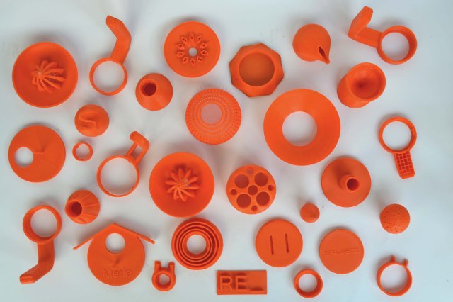 What is interesting about Bernier’s work is that the potential scale and the versatility of the technology lies latent in his work. The lids are then clipped or screwed onto standard jars, tin cans and bottles to create new and personal objects. Huge numbers of iterations are easy to achieve as his Instructables page shows. He made 14 objects in his first collection : a watering can, an hour glass, a long pasta container, a bird house, a bird feeder, a mug, a rain catcher, a maple syrup bottle, a piggy bank, a orange juicer, a snow globe, a paint brush cleaner, a dumb-bell and a lamp.